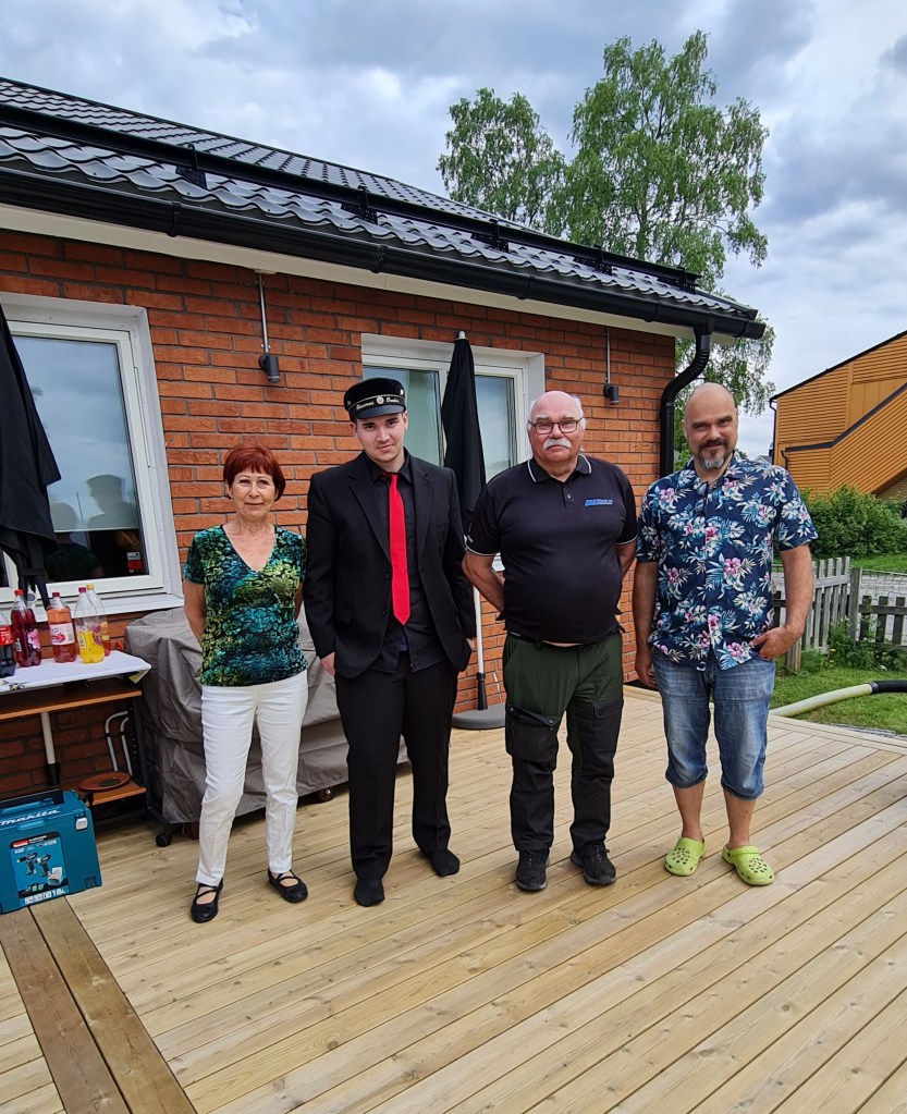 Klockan 20 hade jag städat undan allt, diskat och satt och lyssnade på regnet och tystnaden, filtar på benen, kaffet på bordet. Kavajen har gjort sitt för denna gång. Den har hållits någorlunda ren under alla tre tillfällen den burits under denna vecka. Bal dagen bars den med vit skjorta och limegrön slips för att matcha Tildas klänning. På själva utsläppet, avslutningen och på mottagningen med svart skjorta och röds slips, så snyggt. Dagen gick över förväntan bra, 8 timmar av firande, vädret ställde till det, blåsten och regnet gjorde att engångs tallrikarna och mycket av dekorationerna måste skippas. Tårtor och smörgåstårtor som gjort av Tina på Tinas restaurang, fick med beröm godkänt och vi har ordentliga smörgåstårte kännare i vår släkt! Linda är ju suverän själv på dom och har gjort på beställning hon med. Gräddtårtorna var suveräna de med. Jag kände hur trött mina ben och fötter var då jag äntligen satte mig ner, över 14000 steg visade klockan…. det flesta mellan köket, allt mellan köket och altanen! Rasmus slet av sig kavajen när sista gästen stängde dörren, nu ska jag gå och vila!!!! Danne däckade på soffan, Savannah hade dragit ut. Det var bara jag, Roffe och regnet.