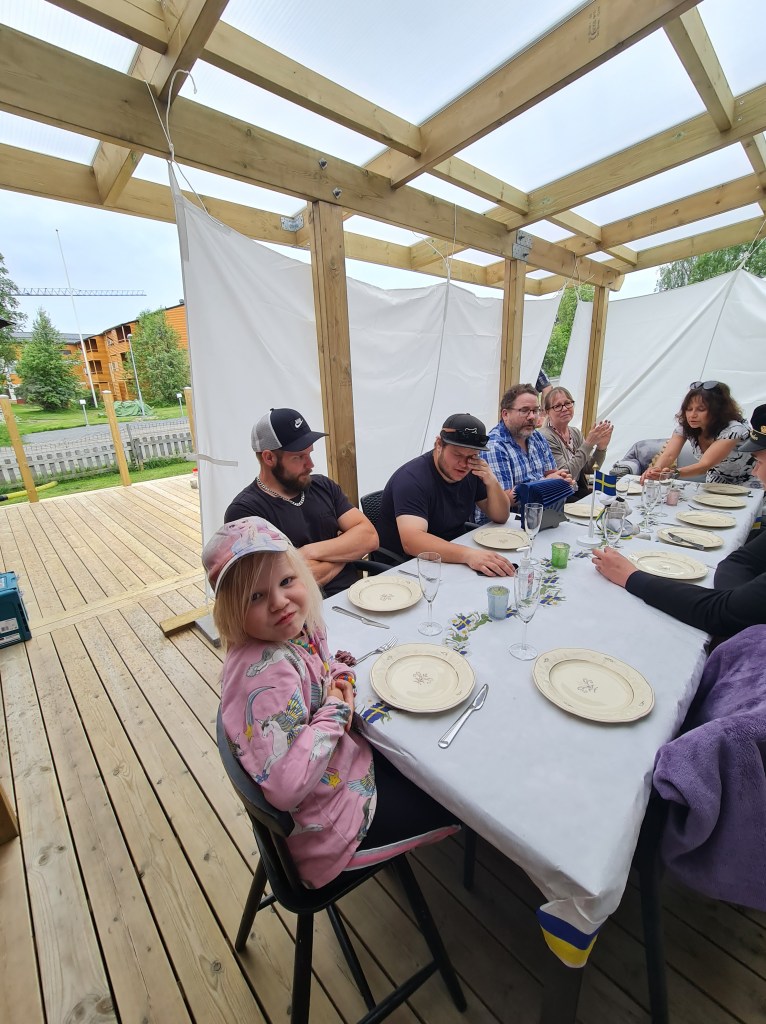 Klockan 12 anlände första gänget, Dannes sida, farmor Marianne, farfar Hasse och Bettan och snyggsyrrorna Nathalie och Vivvi ❤ Rasmus var jätte glad över att de kom. Haparanda visade sig från sin bästa sida när de var här. Det hade öst ner i Råneå sa de och i Töre stod regnet som spön i backen. Vi hade sol och 21 grader varmt.