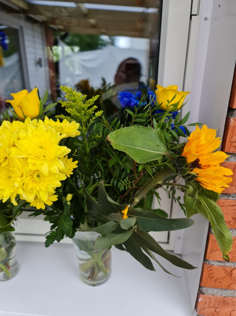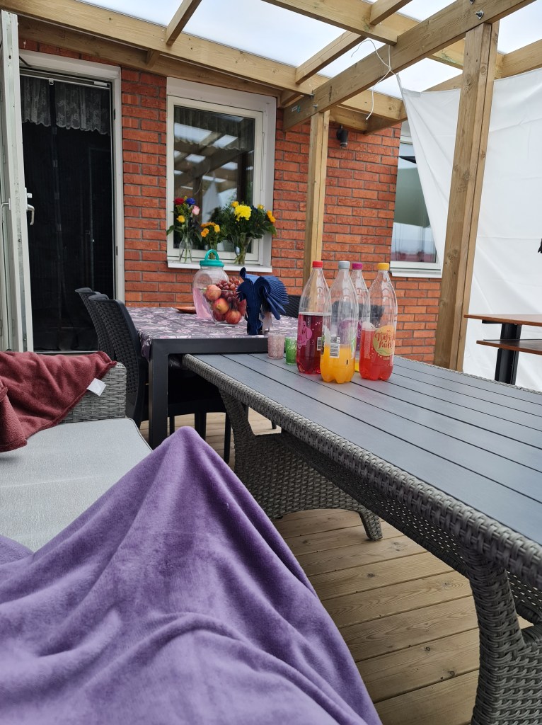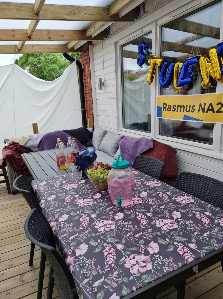 Jag steg upp redan vid 06.30 så jag skulle hinna få i mig kaffe och göra mitt. Vädret var soligt och fint 21 grader varmt men det blåste utav bara faaan! Det är sällan det blåser rakt in på vår altan men det gjorde det naturligtvis nu. Jaha vad gör vi? Danne hade en idé, vi drar till IKEA och köper segelduk. Pga pandemin så hade vi 3 sittningar, 2 timmar vardera med 30 minuter mellan så jag skulle hinna städa undan och duka nytt. Planerat var ju engångstallrikar så att jag skulle slippa diska men se det blåste ju så det gick inte. Inga bordsdekorationer gick heller, allt hade ju flugit runt! Planeringen med 3 bord gick ju inte heller, vi har ju stor altan så meningen var att dela upp alla på 3 bord i de större gängen men det gick ju oxå bort!