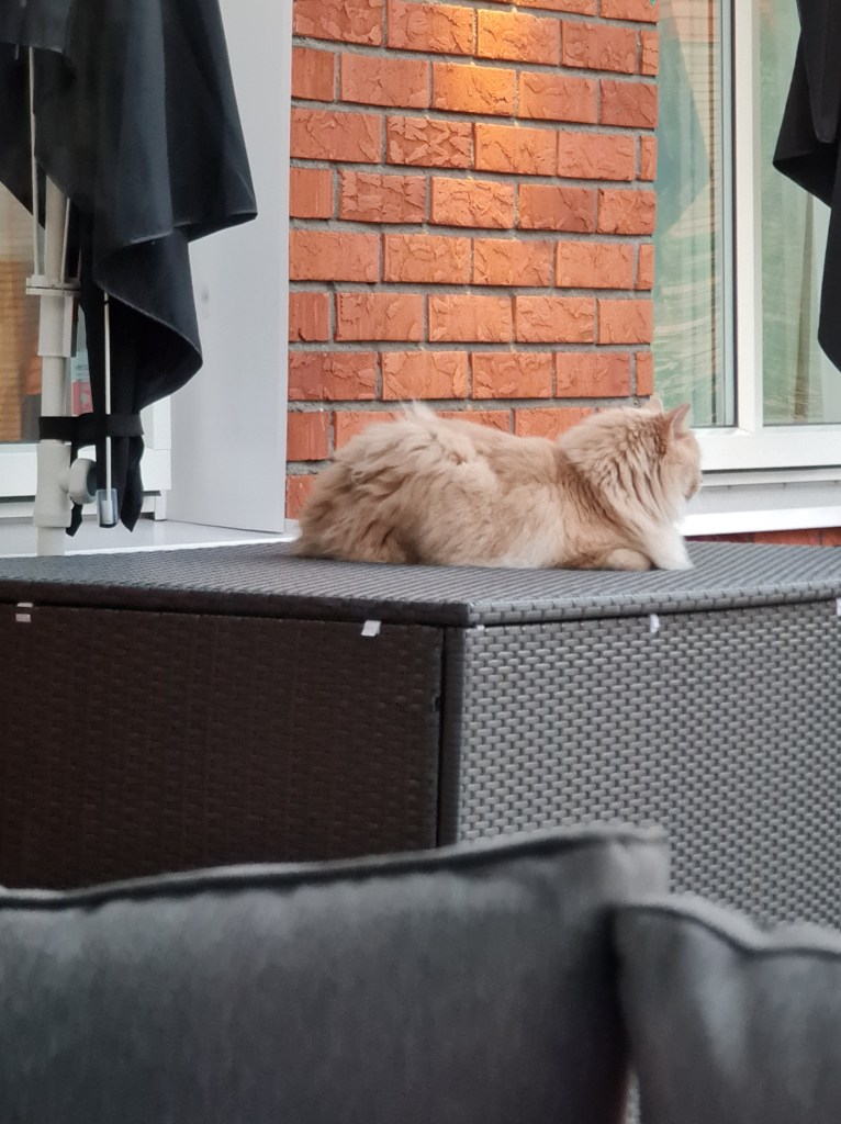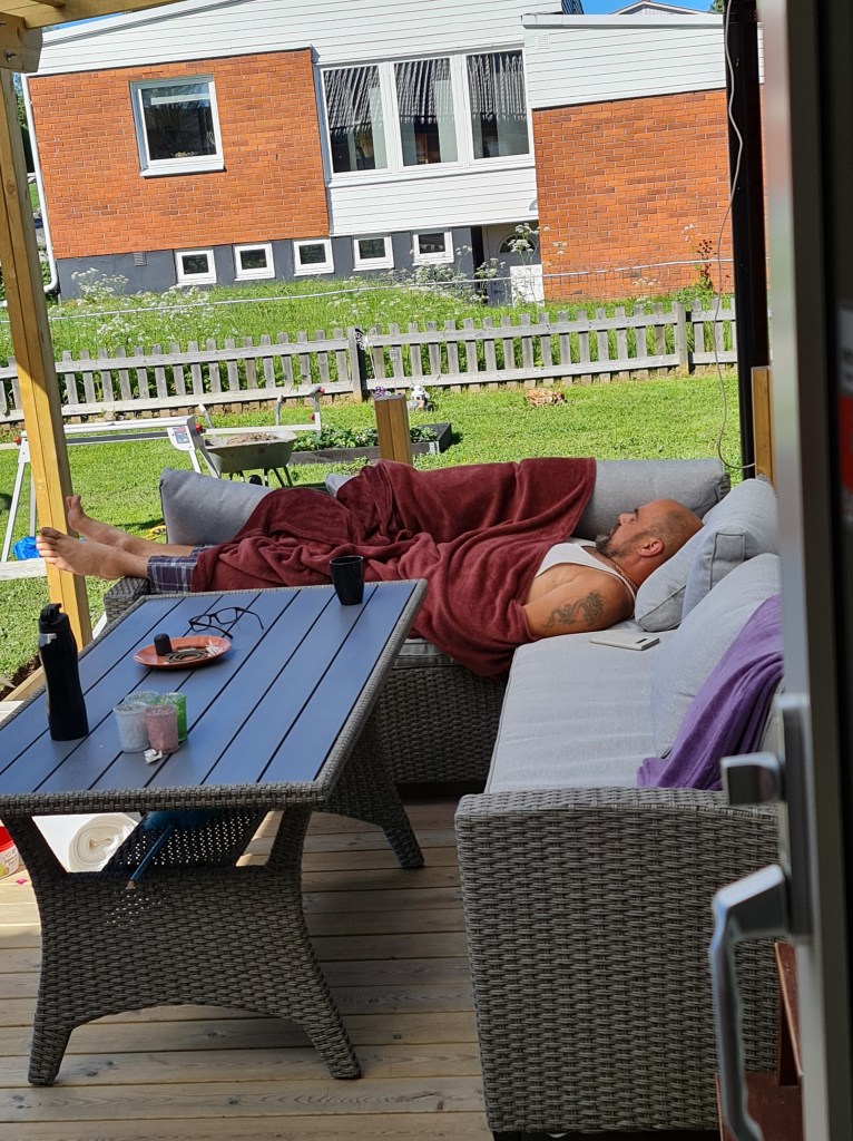 Underbart väder, stiger upp kl 07.45, tog lite sov morgon. Jag var så jävla trött, messade Rasmus och frågade om han var vaken, japp, så jag sov vidare. Brukar annars vara vaken vid 06, ser till att han kliver upp, vi pratar lite innan han far till jobbet, chanserna till prat är annars inte så många. Men på mornarna och sent på kvällen då hinner vi och då går det att prata. Tog mitt morgon kaffe i soffan där ute, så skönt, Danne kom oxå och somnade genast, det blev morgon lur i utemöblerna istället för i soffan framför tvn 🙂 Så ska det vara, det ska vara som varmt redan på morgonen att det är fullt möjligt att sitta i morgonrock och dricka kaffe utan att frysa
