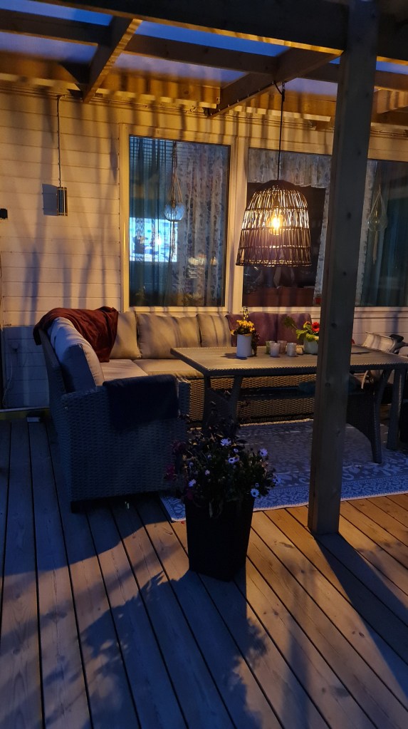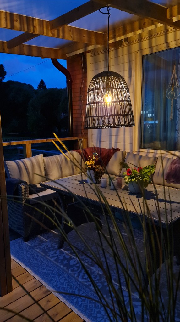 Danne har köpt en ny lampa till mig, jätte fin, var den. Den kom upp igår, det blev så mysigt. En härlig kväll, 17 grader varmt var det…..