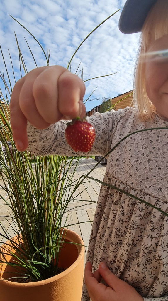 En härlig dag igår igen med plus 18 grader, solen värmde riktigt när vi var och promenixade från jobbet. Jo jag såg 3 killar ute fr skolan, papper och pennor i händerna, typ 7or. 1 killen, ledaren av de tre sparkade ner hängrännan på Amanda huset. Jag ropade till, vad gör du, det där var väl onödigt! Jo säger han, jag sa att sätt upp den då, Näää svarar han och går vidare, kaxig utav bara den! Jävla skit ungar, tog foton på dom så jag vet, tänkte fråga runt lite! Det har ju varit varmt igen de sista dagarna och det blommar i jordgubbslandet. 1 färdig gubbe hittade Alicia.