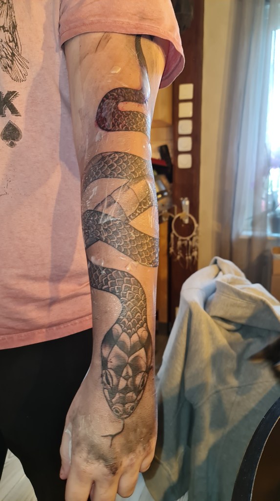 Rasmus var och gjorde en tatuering igår. Han säger inte riktigt hur länge det ska ta och nånstans fick jag för mig att det tar kanske en timme för lite så pratade han. Han dök inte upp, det gick 3 och 4 timmar och ingen Rasmus. Jag försökte ringa, men telefonen var av, ingen hade hört nått ifrån honom. Jag blev lite orolig i och med att hans bil inte heller e riktigt kurant, den behöver byta lite delar och det ska göras idag. Den går som ett snor efter vägarna just. Nå tänkte jag han dyker väl upp, han kan få för sig att bara dra iväg nån annanstans med. Men efter 18 kommer han hem med detta på armen!