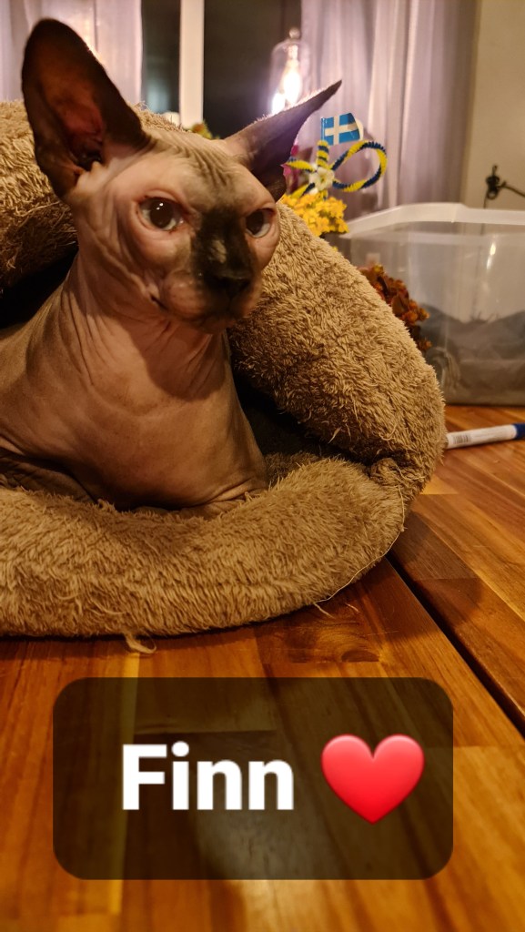 Som ni ser så är det en Sphynx, en naken katt på svenska 🙂 Jag hjälper min kompis Åsa som har två. Den äldre av dom har fått epilieps och Finn var allt annat än trevlig med stackars Olle. Det gick helt enkelt inte tillslut, den började attackera när Olle hade anfall. Det är ju tyvärr inte ovanligt när det kommer till katter att det blir så. Så då ska Finn bo med mig på obestämd tid. Men nu ska Olle börja medicineras, undersökas från topp till tå, när katter får ep så beror det oftast på något annat så det ska kollas. Sen får vi ta det därifrån. Men så länge det behövs så bor Finn med oss, en månad, ett år eller resten av livet det får vi se ❤