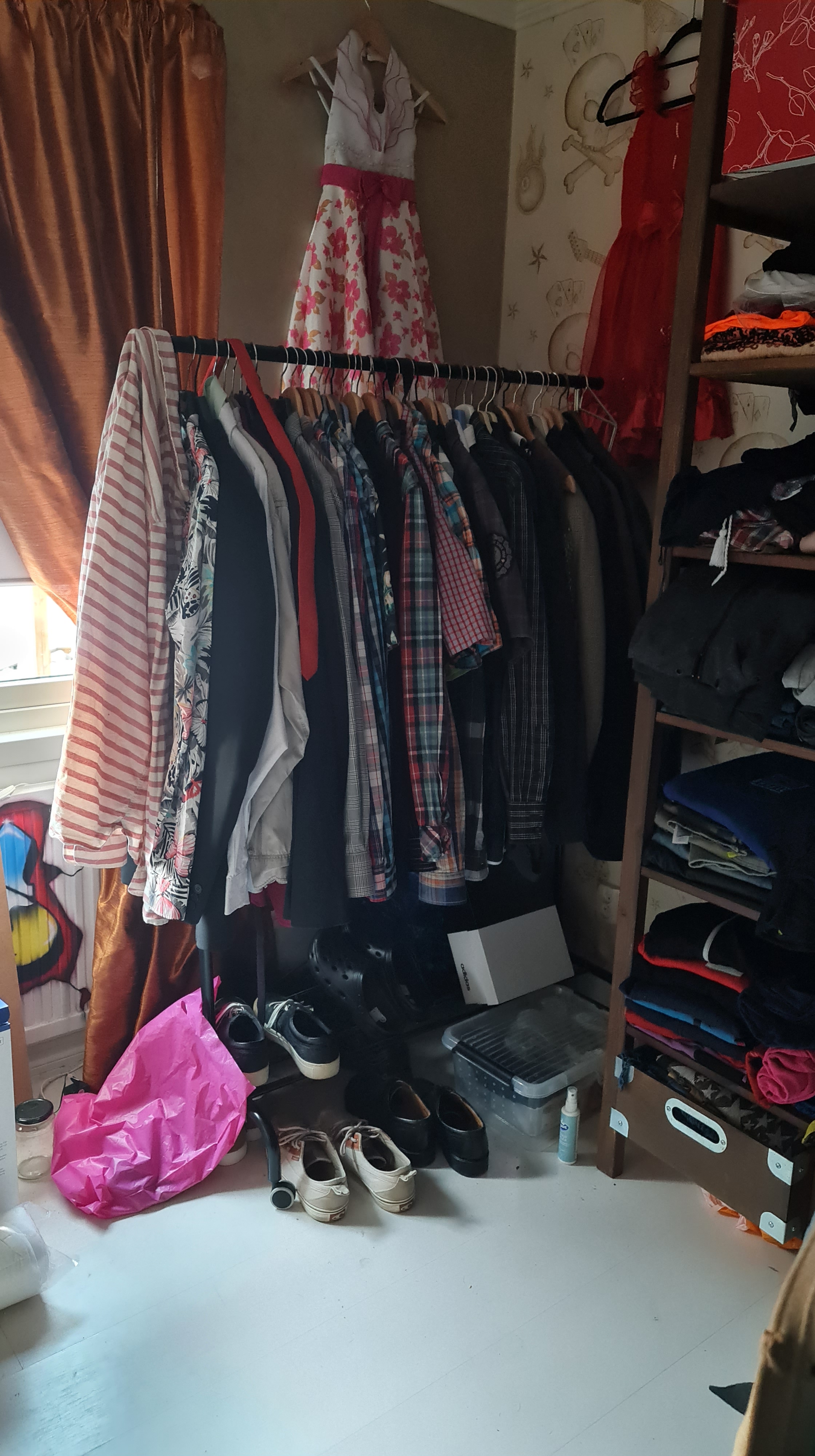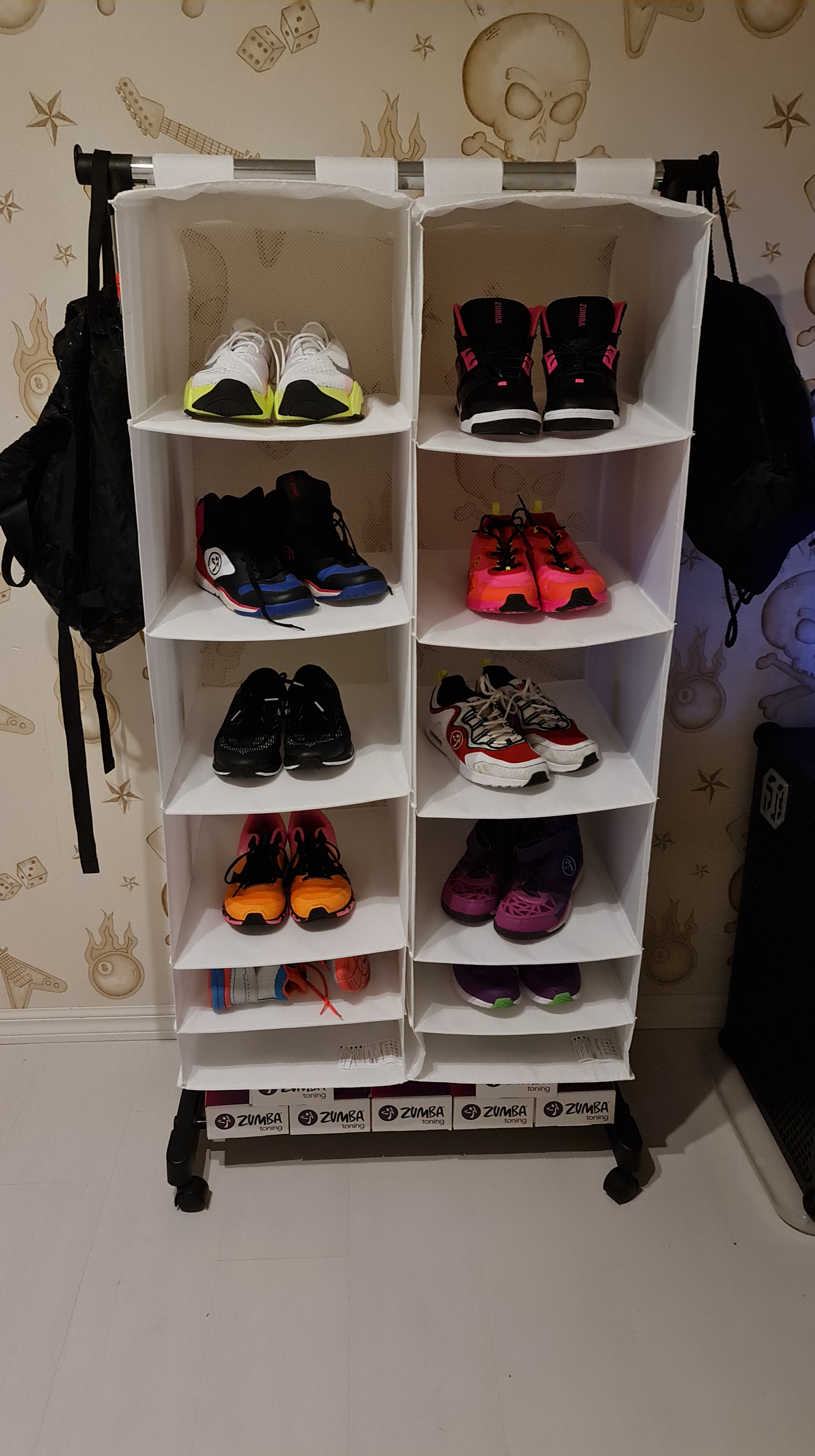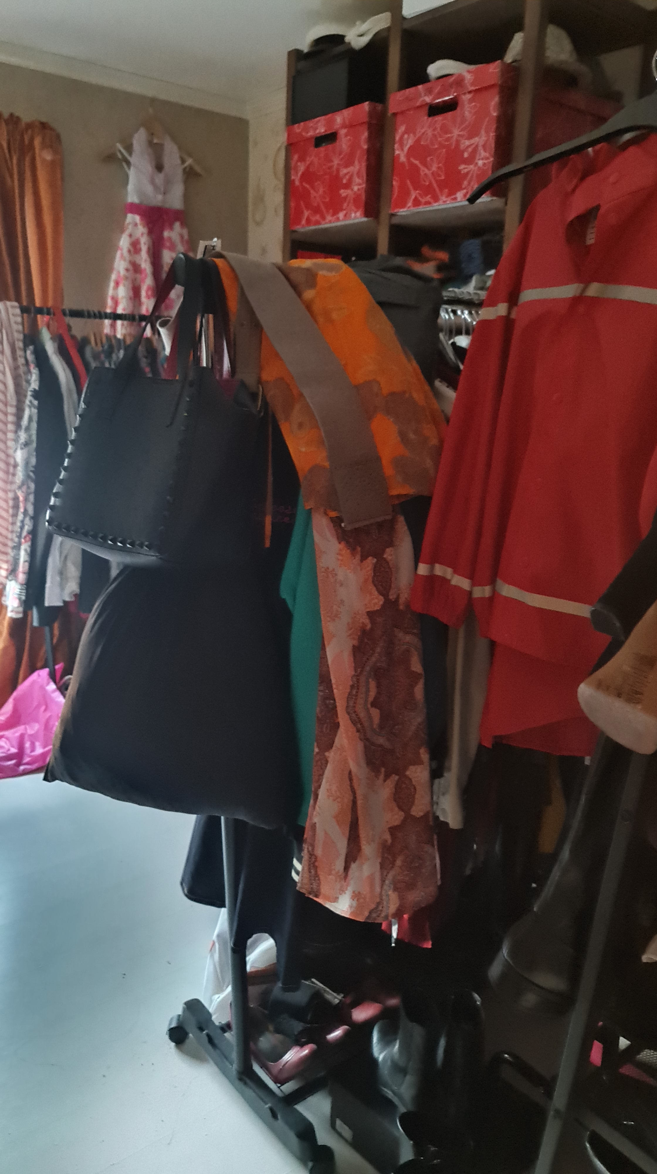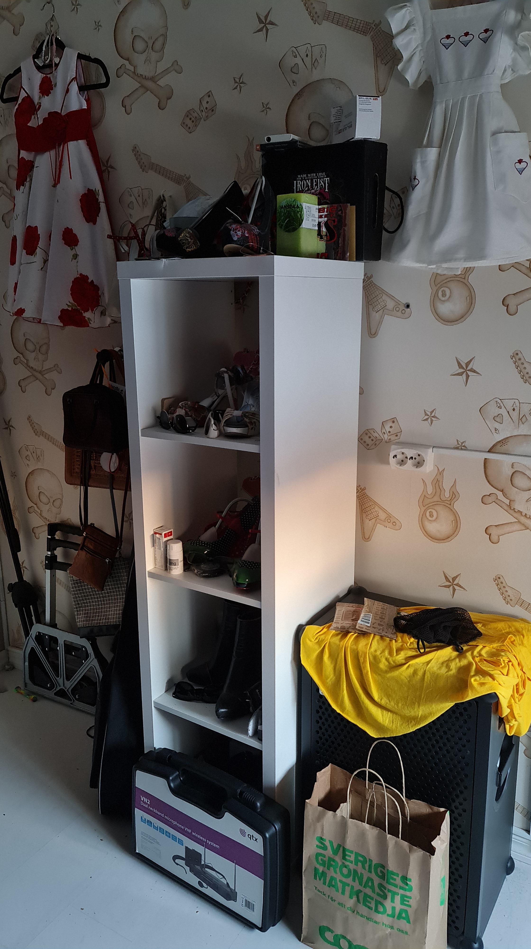 När jag sen kom hem så började jag med vår garderob!! Ja det var inte lite göra det. Zumba kläderna från vardagsrummet sorterades in i trådbackarna, lite svårare att se nu hade behövt en till trådback men jag ska köpa en och sortera om. Skorna åkte in i lilla rummet, de rymdes helt enkelt inte. Sen flytta hyllorna, in med alla våra kläder, sortera i dom, rensa, göra om, placera allt, var ska allt vara!, Jag ska ännu göra om lite grann i rummet bland alla mina scarfs tänkte jag. Men nu är det bara att köpa in ett skrivbord och börja göra iordning för ”kontoret”