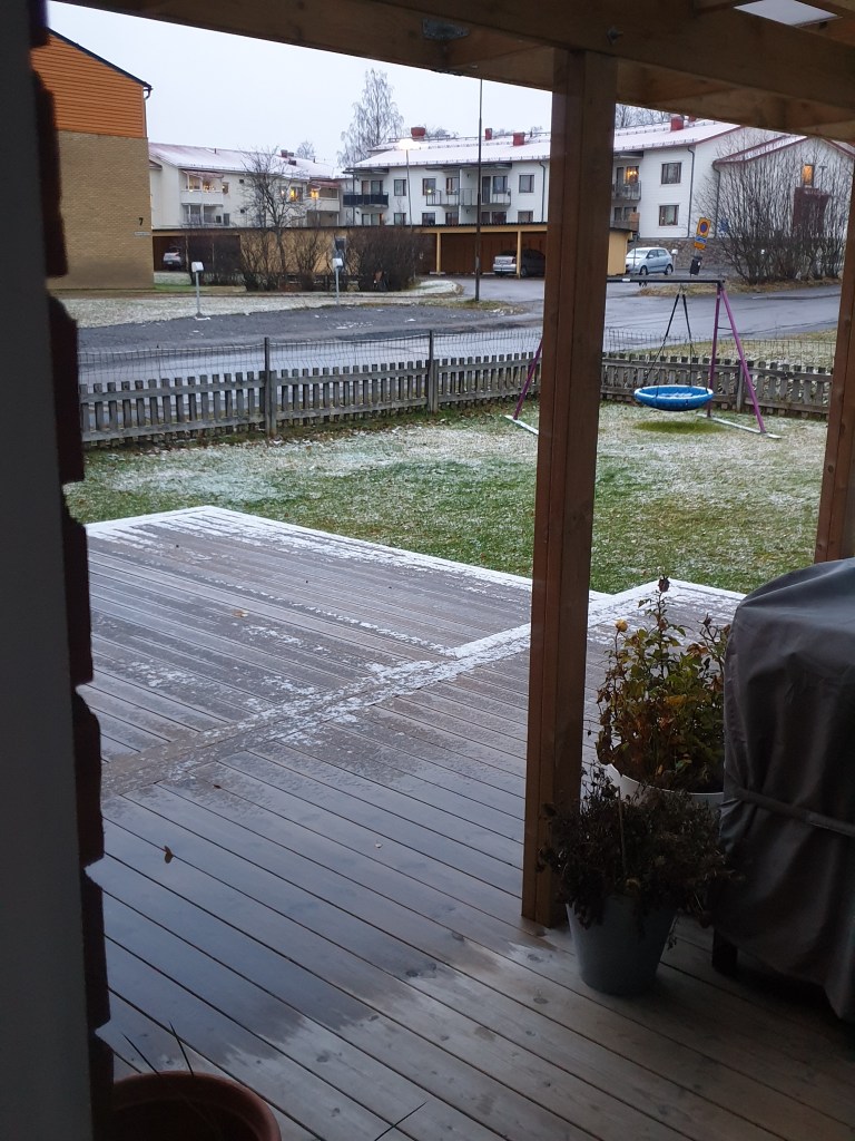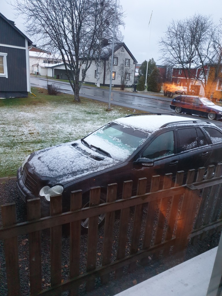 Det hade snöat under natten. Lite snö kvar på bilar och gräsmattor….. fan me don’t like! Läser ofta nu blir det ljusare ute…. skaffa dig en pannlampa tänker jag. Det blir så fint ute…… nja, modd, grå snö av alla avgaser, så det vet jag nu inte heller! Jag är ju inget fan av snö.
