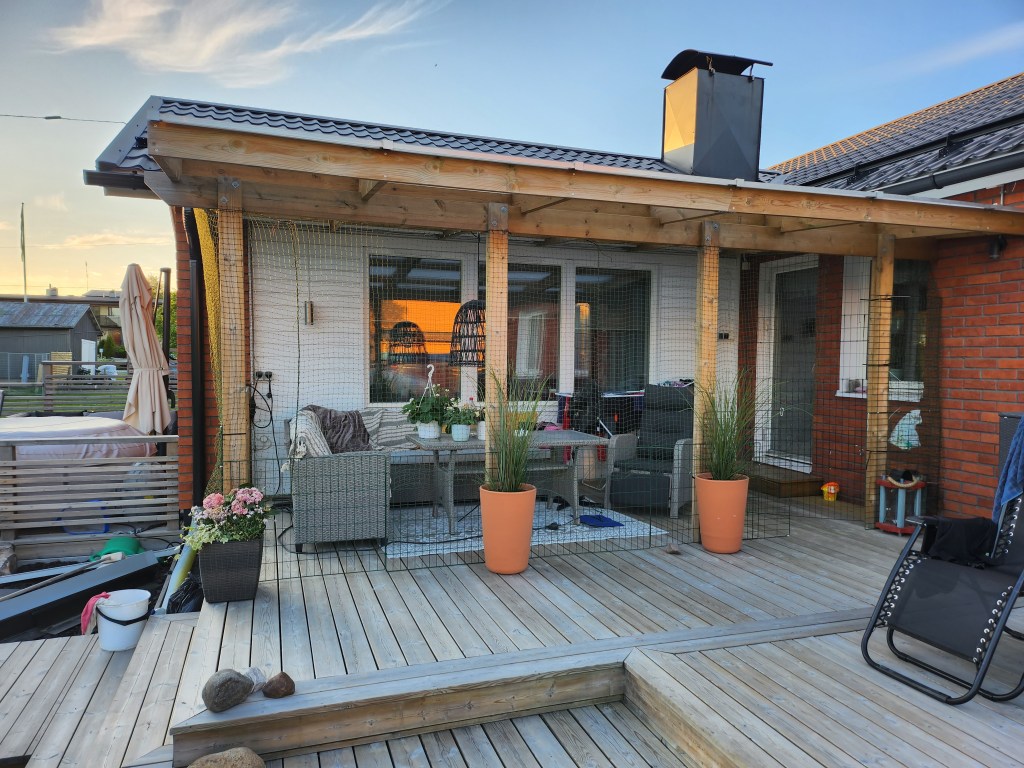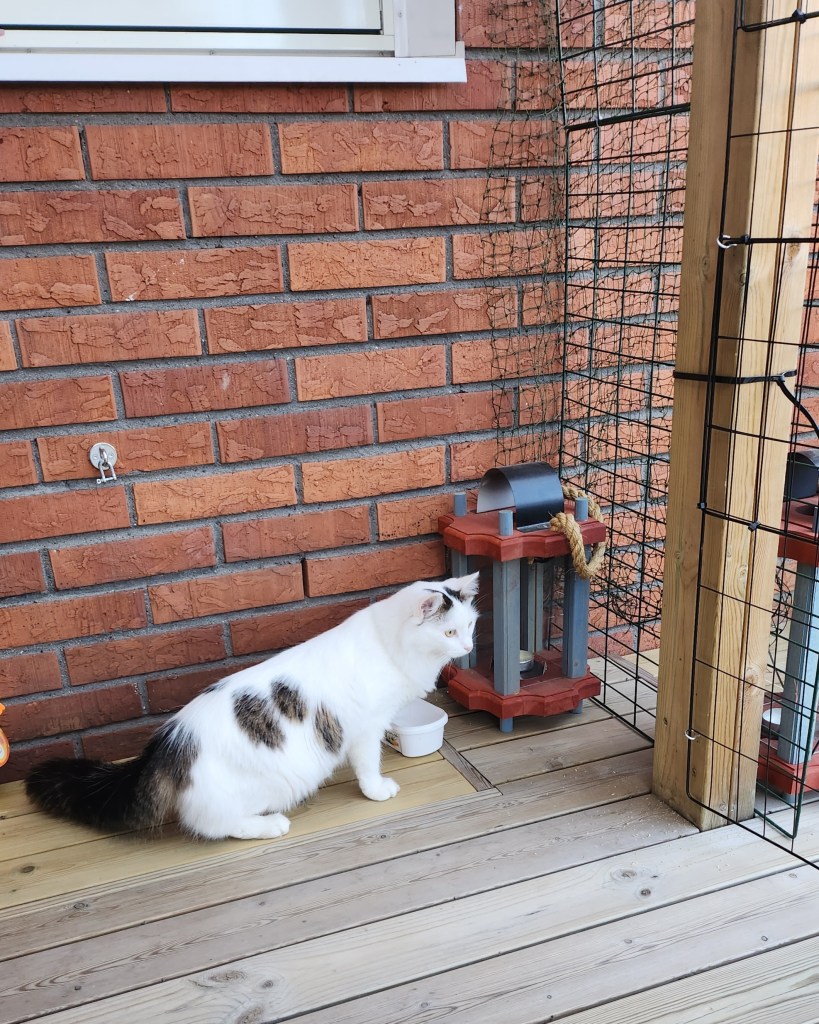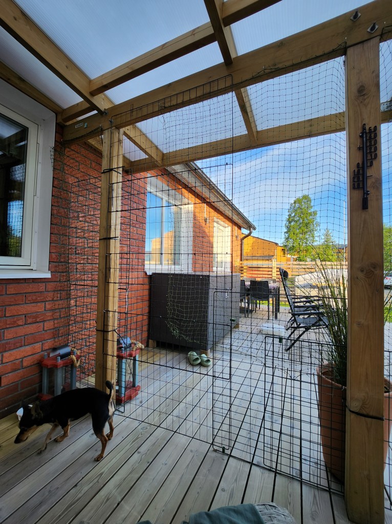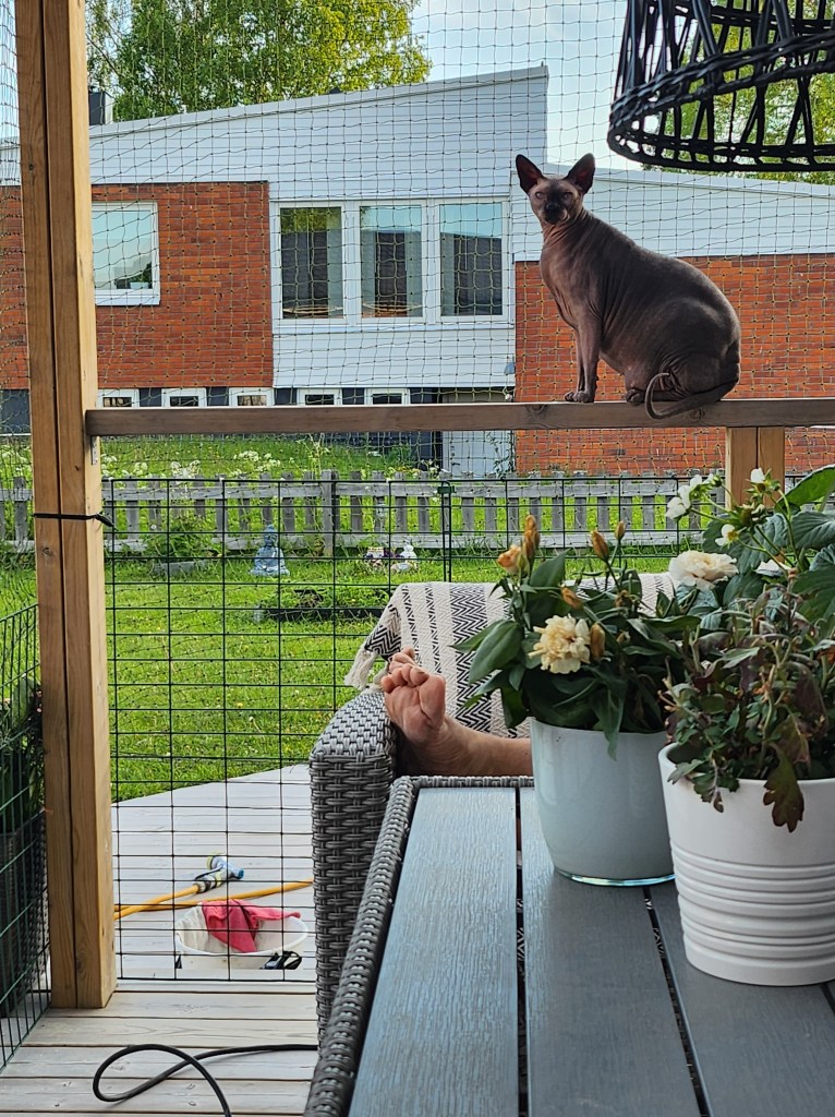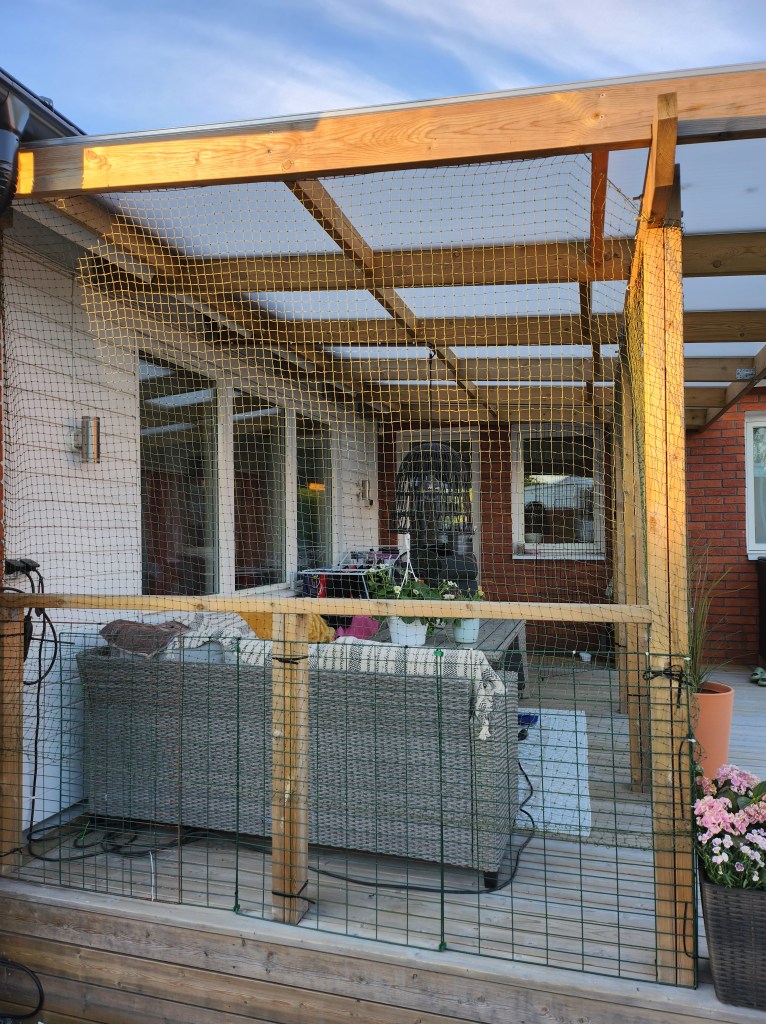 Vilka dagar det varit och det ser ut att fortsätta. Men det är så man knappt vågar andas! Vi har fått så mycket gjort den här veckan. Den nya myggdörren är färdig byggd, bara att hänga upp, Savannahs portabla AC är klar, vi har valt att borra hål i väggen och leda ut den där, poolerna är uppe och igår höll vi på hela dagen med att kattsäkra altanen. Vi har ju bara haft galler tidigare när vi då bara hade Finn som inte får gå fritt. Men han hoppade ju inte, han kunde sitta på överliggaren och skrika men ha fattade inte att hoppa ner eller ens över 70 cm höga galler. Men jag tror det berodde på att han faktiskt har svårt att se när det är soligt. Han kisar och man ser att han problem. Men nu har vi 5 katter här hemma då och bara Bamse som går fritt. Men vi vill att de ska kunna komma ut ändå och nu kan de det.