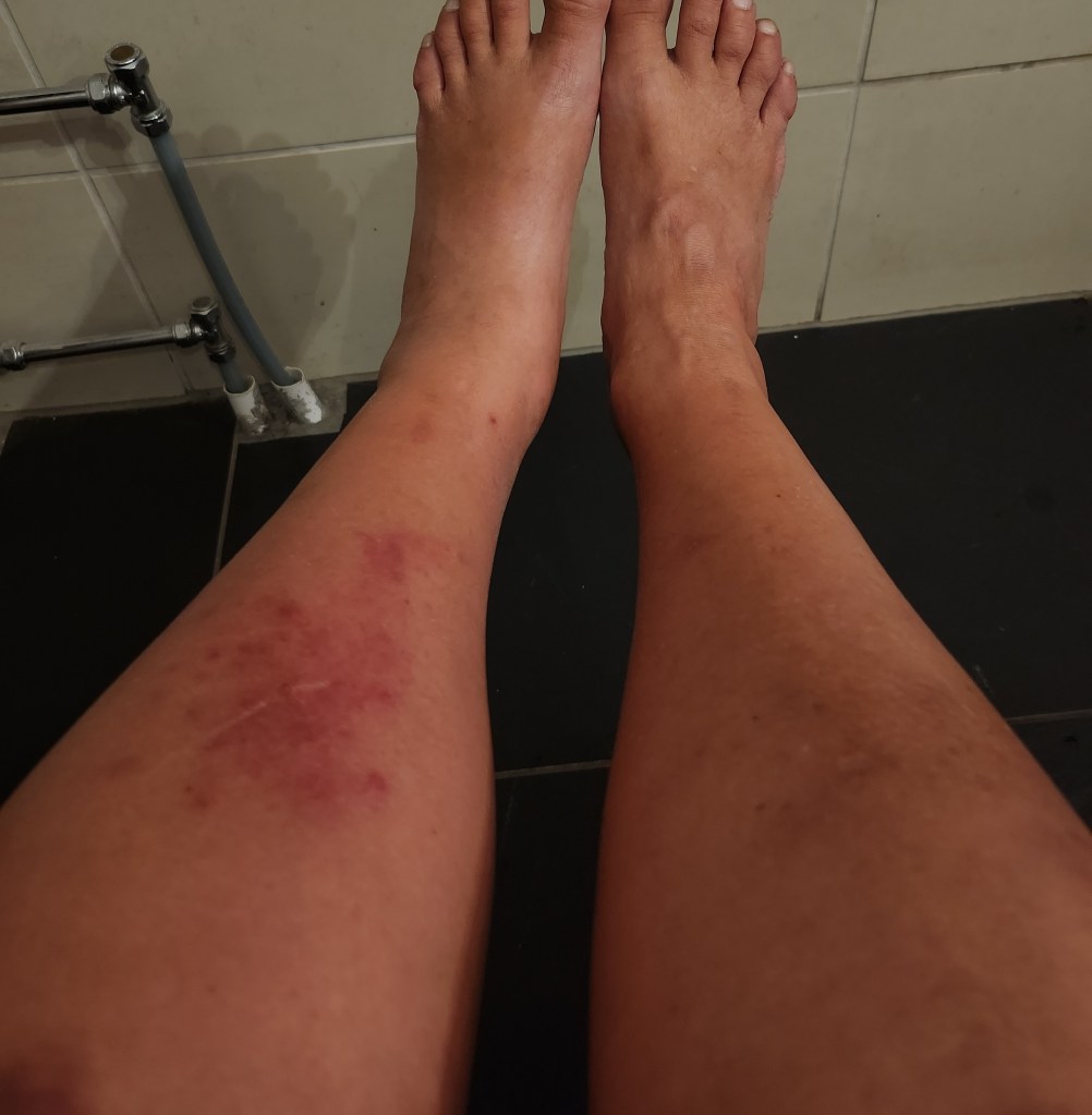 Jag hade ont som fan i benet, sen vällde foten oxå upp på insidan och senare även ovanpå. Tror jag hade detta förra hösten oxå. Några veckor efter det att jag slagit i benet så blev jag röd på benet, det var varmt och svällde upp, precis som nu rann det neråt och foten svällde från insidan, sen utsidan och och så uppe på. Det höll ju på i flera månader. Men inte fattade jag att det kunder vara bältros, tänkte att det var från det att jag smällde i benet.