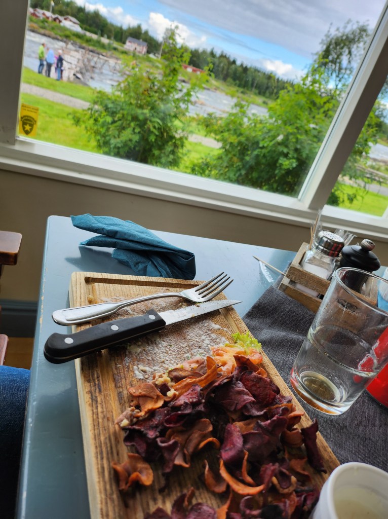 Sen stannade vi till på Kukkolaforsen och käkade, tog Kukkolaburgaren, orkade inte ens äta upp allt. Deras rotchips som den själva gör är underbara!