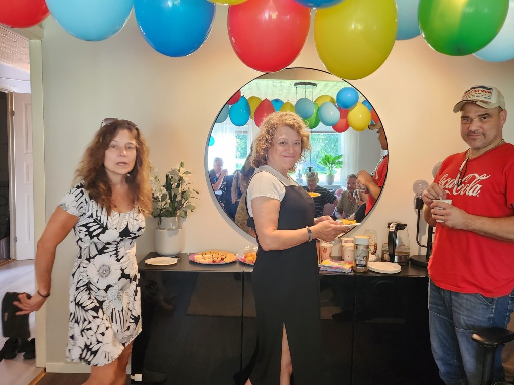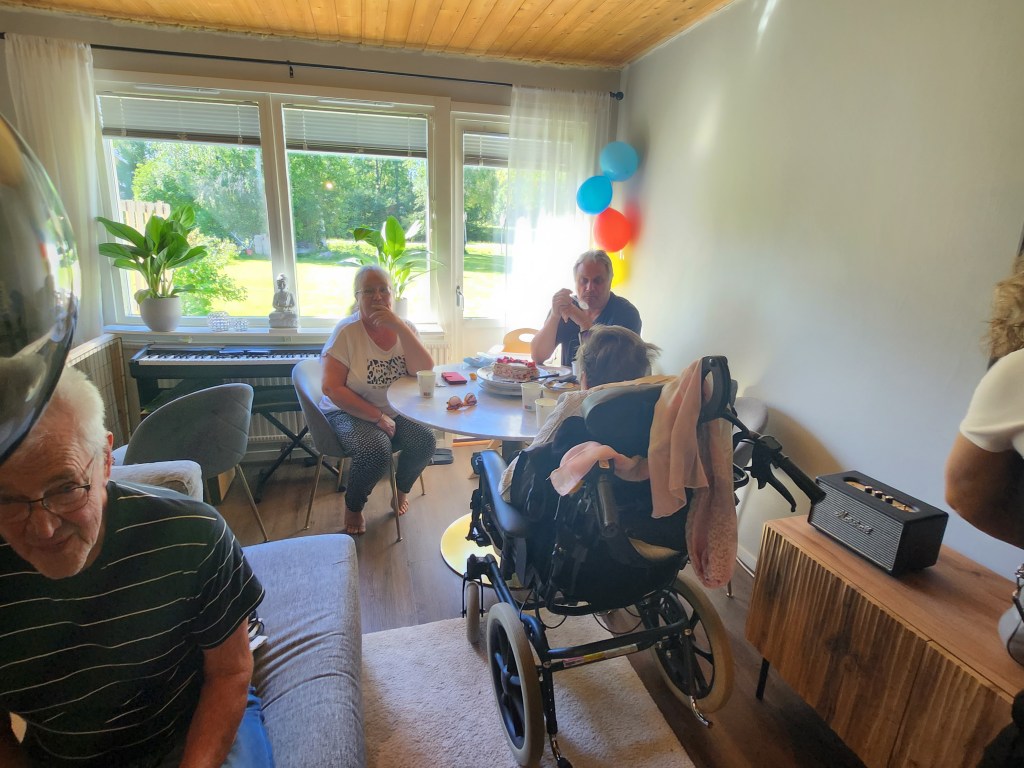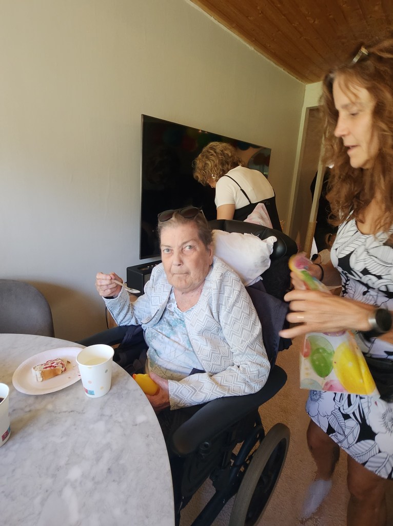 Mamma hade haft det så bra, hon sa att det är så roligt att få träffa alla, hon hade en bra dag och kände igen alla när hon fick fundera en stund. Anka och Virva Nettes mamma och pappa, Anka känner hon sen tidigare och kom ihåg honom. Men sen Virva, var lite svårt, de har ju jobbat ihop men jag tror det gick upp ett ljus sen. Kristina och Görgen var inga problem och inte Gunhild heller. Järre och Dennis blandar hon ihop fast inte när de ät tillsammans, då vet hon inte riktigt vem Järre är och då är ofta Dennis Järre så hon ser väl likheten då. Men när hon fått fundera så tror jag hon visste vem alla var. Hon sa när vi rullade in henne på Hemstranden, jag ha ringen lust att fara hem nu. Det har varit en så trevlig dag. Det är så roligt att vi kan ha med henne, det är viktigt för henne och jätte viktigt för oss. Vi vill ge henne fina sista år så länge hon kan.