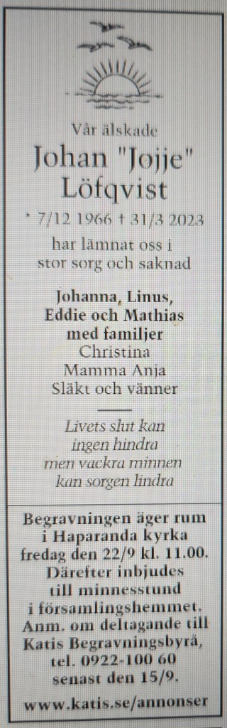 Jaaa Jojje nu blev det din tur. Flera utav våra kompisar från förr har dött de sista två åren, och nu alltså du.