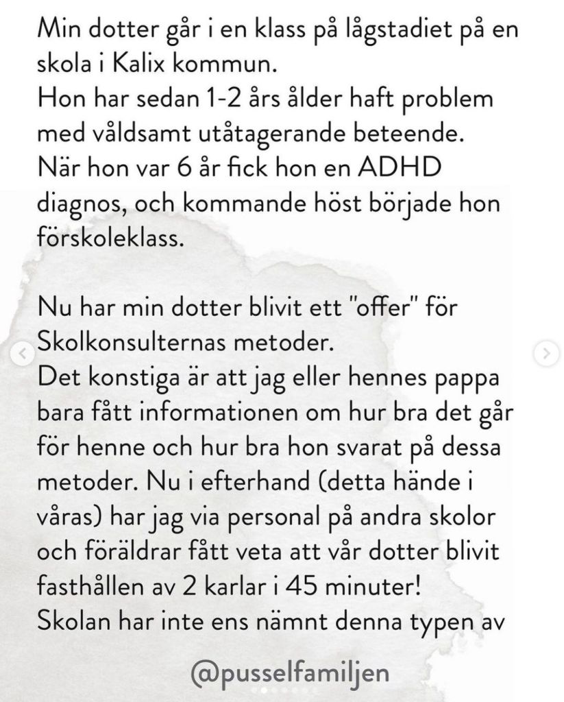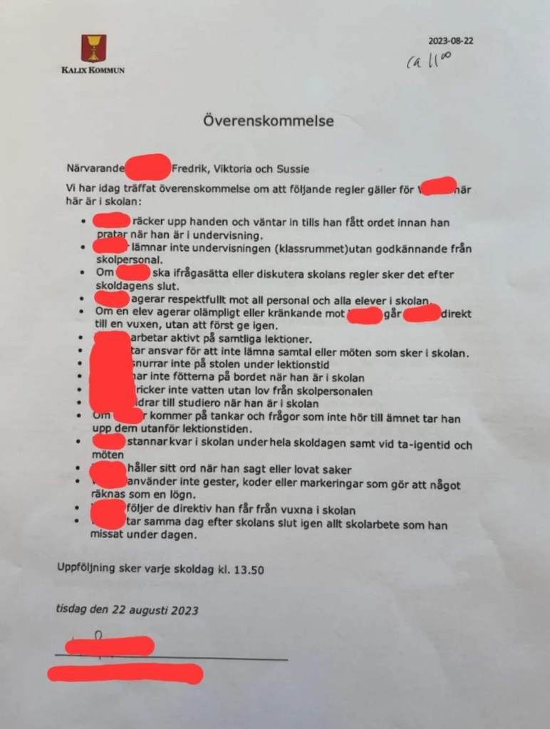Det här är vad mamman skriver och hennes sons kontrakt. Efter detta har det verkligen som hon säger exploderat! Det dyker upp vittnes mål överallt ifrån. En mamma oxå från Kalix skriver att hennes dotter är 6 år och går i förskoleklass och har fått diagnosen ADHD. hon har blivit utsatt för fasthållning av 2 män i 45 minuter…..en 6 årig flicka????