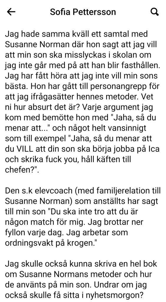 Vittnesmålen om fasthållning och kränkande behandling tar inte slut, hot och våld. Man får sträck om man inte klarat sin lista, om man bryter mot den, protesterar osv. Då får du ett sträck i slutet av dagen omvandlas den till minutrar och då får du kvarsittning….. Tänk alla barn med npf diagnoser, Savannah läste kontraktet Sofias son fått och sa direkt att jag hade fått kvarsittning varenda dag. Jag menar de har bla problem med impulskontroll, tar ett exempel, en lektionen om lampor, den kan leda till en spontan tanke om när lampan hemma exploderade och man bara måste få berätta det. Redan här hade hon brutit på flera punkter i det kontraktet. Då skulle on blivit bestraffad istället för att kanske dra nytta av hennes spontanitet, det gällde ju lampor. Aha, varför kunde den ha exploderat och pratat runt det.