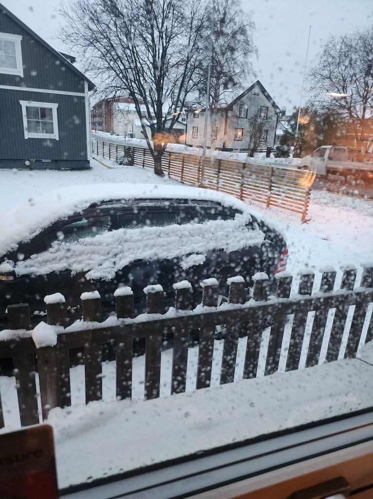 Regnet fullständigt öste ner när jag gick och la mig igår, så mycket har det nog inte regnat på länge. Sen när jag steg upp vi 03 och drack vatten så hade det snöat! Snön ligger ännu kvar, tung och blöt ser den ut att vara!