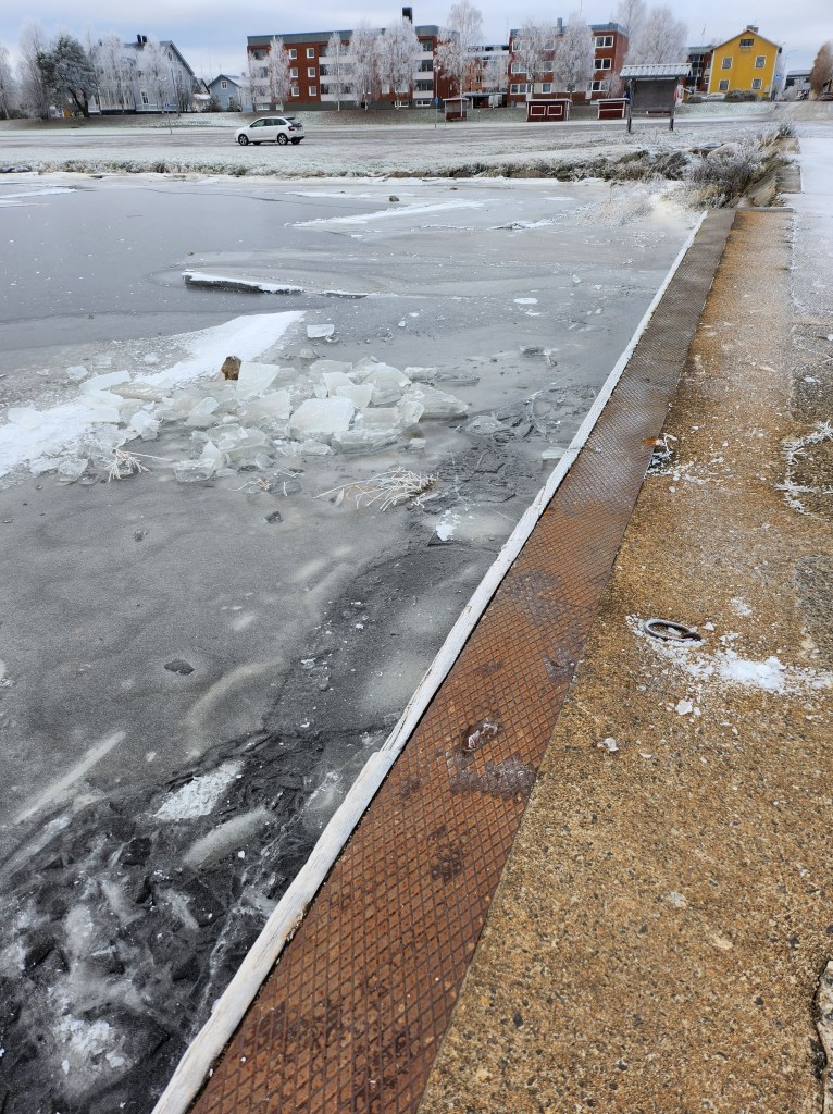 Men gud så kallt det är, det har blivit kallt snabbt…. det är inte bra med tanke på vårt isbad…. det är inte i än! Och isen är över 10 cm tjock redan! Hoppas det blir varmare så det smälter undan. Vattnet är oxå högt ända upp till kajkanten. Så jag vet inte om det är tur eller otur att det inte är i än. Om det varit i, vad hade hänt med landgången när vattnet steg så mycket? Den hade nog lyft hela bryggan eller hade allt följt med? Sätter vi i när det är så högt, vad händer när det sjunker? Nå är ingen kärnfysiker nr det kommer till såna grejer 🙂 Var ner igår och kollade lite hur det ser ut.