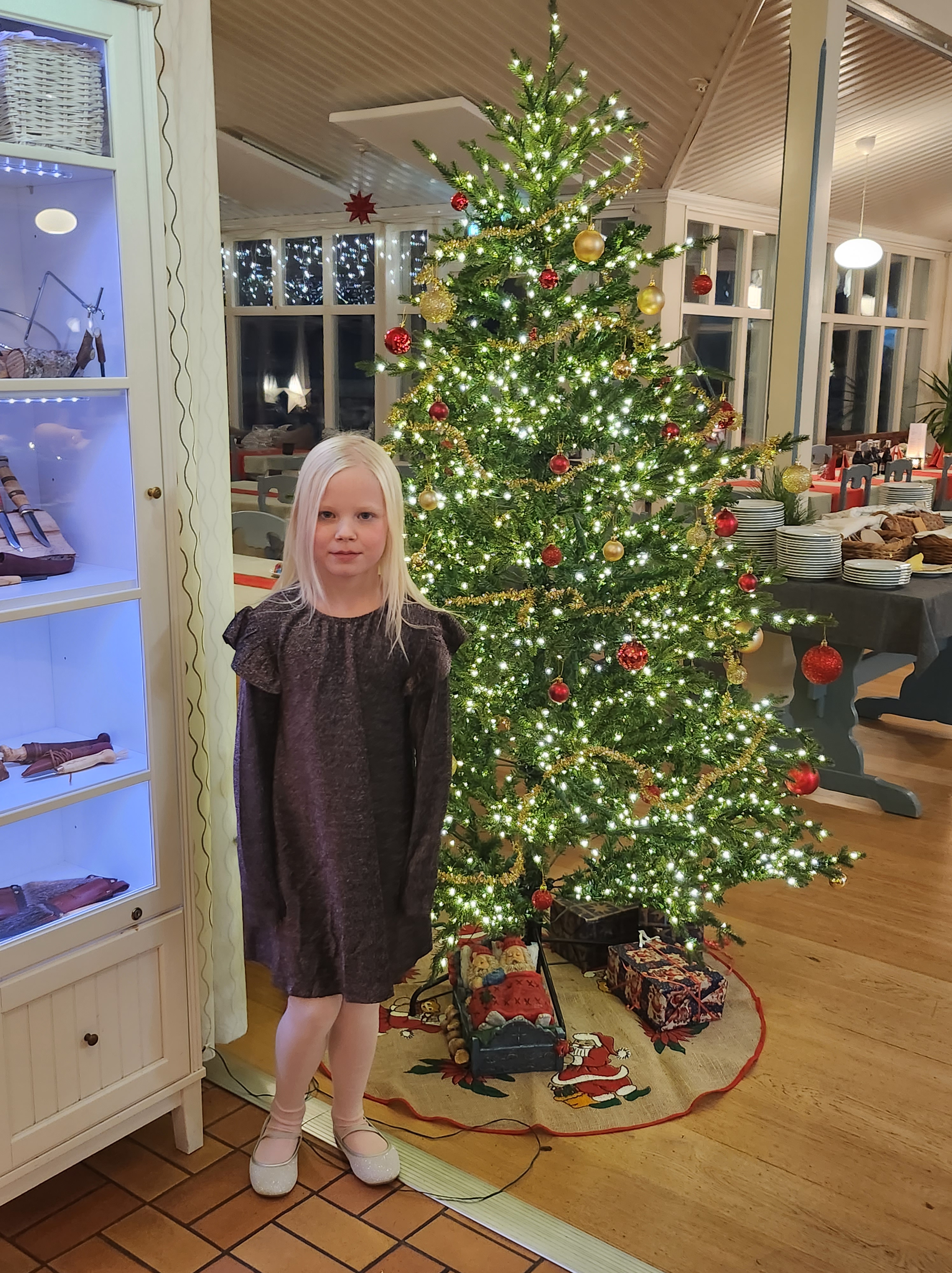 Vi var först till morsan och lämnade lusse fika till henne, det vi bakade på lördag. Sen iväg till Freya med en påse lussebullar och lite små presenter så här på 2a advent. Klockan 13.30 drog vi hem och bytte kläder, fixade oss lite och så iväg på julmiddag i Kukkolaforsen, vi blev bjudna dit. Det var riktigt trevligt, mycket turister, asiater klädda upp till tänderna, de verkade tycka vi hade kallt 🙂