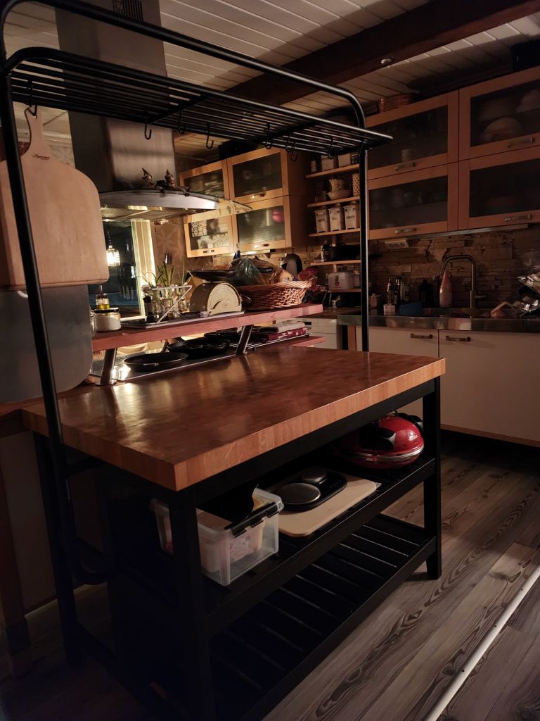 På eftermiddagen möblerade jag om i köket… vår nya möbeln, Dannes arbetsyta till sin pizza bakning har kommit…..