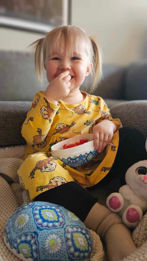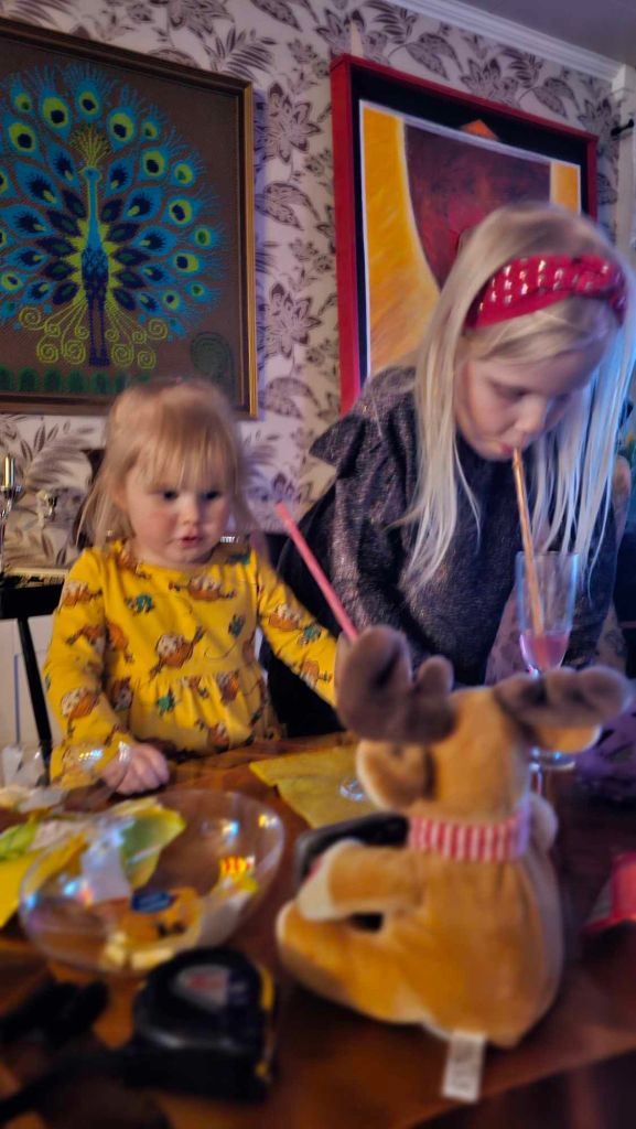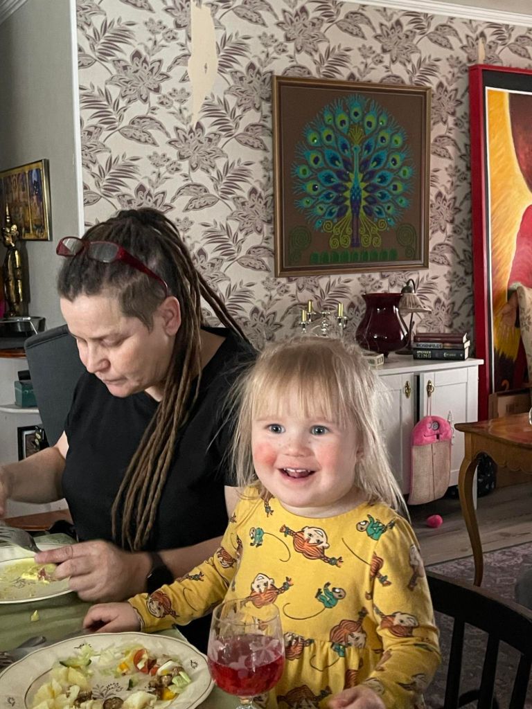 Jag tycker om att ha min familj med alla barn, barnbarn, systrar, mamma. släkt och vänner runt mig. Tycker om att ordna så att vi kan samlas, att vara alla. Det är viktigt för mig så länge vi kan. Och nu när mamma oxå bor här så hämtar jag henne så fort jag kan så hon får vara med. Det är lite kruxigt att få in henne och med att vi har trappor, så det är en del bärande och lyftande. Men som tur är har vi ju Dennis som får ta det tyngsta och sen lyfter vi andra var vi kan. Det är trångt och vi måste vara en på varsin sida om stolen. Man måste ju lyfta den i ramen. Det är lite krångel men det gick smidigt igår tyckte jag. Men jag gör det så gärna för jag vill att hon ska kunna vara med. Man vet aldrig när det längre inte går.