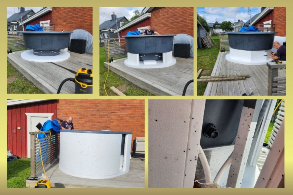 När sittdelen var klar tejpade vi skarvarna för att de skulle hålla ihop när vi joxar med karet. Vi drog även sån bygg plasttejp eller vad det nu heter, ni vet sån som blir som klistrigt nästan när det ligger på varann, det brukar surras runt last på lastpallar och annat. När allt var på plats tejpade vi skarvarna och så lyfte jag försiktigt och Danne drog ut frigolitstöttorna genom hålet där alla slangar kommer. Med spänning släppte jag ner karet, yes, det stod stadigt och inget gled ur plats! Sen var det dags att surra sån plast runt hela karet. Nu står det där! Dannes funderingar efter att vi släppt ner allt….. hoppas jag nu inte glömt nått. Vi gick igenom allt, allt är kopplat som kan kopplas, allt är där det ska. Men förstår nervositeten!
