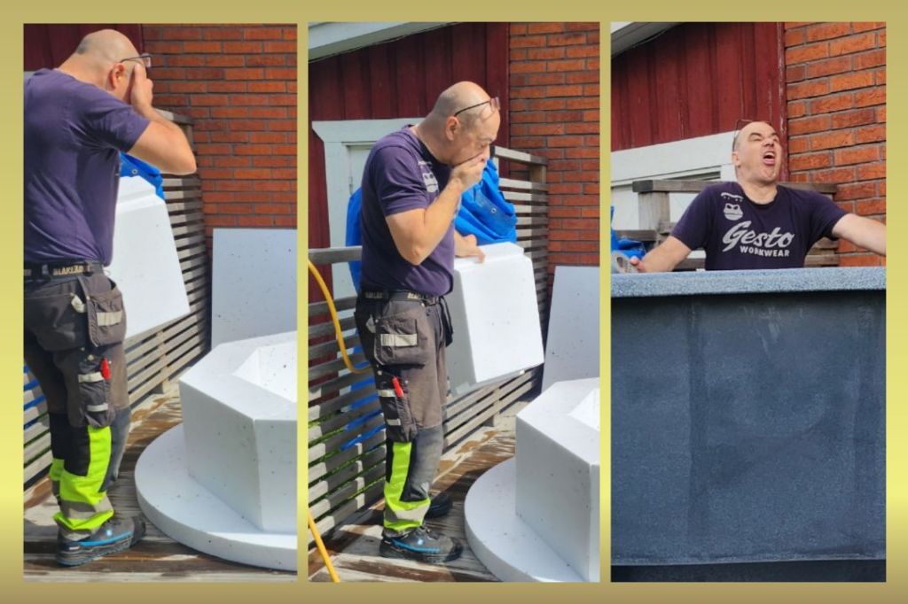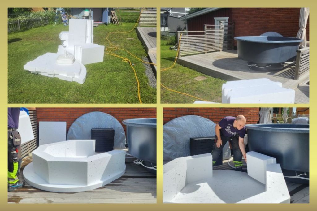Och igår var det dags att ta tag i allt. Vi satte botten och underdelen på plats, markerade var den skulle stå. Tog ner allt igen. Men hur gör Börje nu??? Vi lyfte karet på plats på bottenplattan. Vi kom på snille iden med stöttor som vi skulle placera under kanten och som lyfta upp det en bit så vi kunde sätta sittdelarna på plats…. jo det gick ju jätte bra med den första stöttan men när vi lyfte karet på motsatt sida blev det ju vingligt och den gled åt sidan… satan då… funderade igen, vi var ju bara jag och Danne…. nå då kom Danne på att vi lägger överbliven frigolit under karet och på så vis fick vi upp det och kunde börja bygga. Den stora plattan under karet togs ut och vi delade den i mindre ”remsor” så vi kunde dra ut dom när allt var klart.