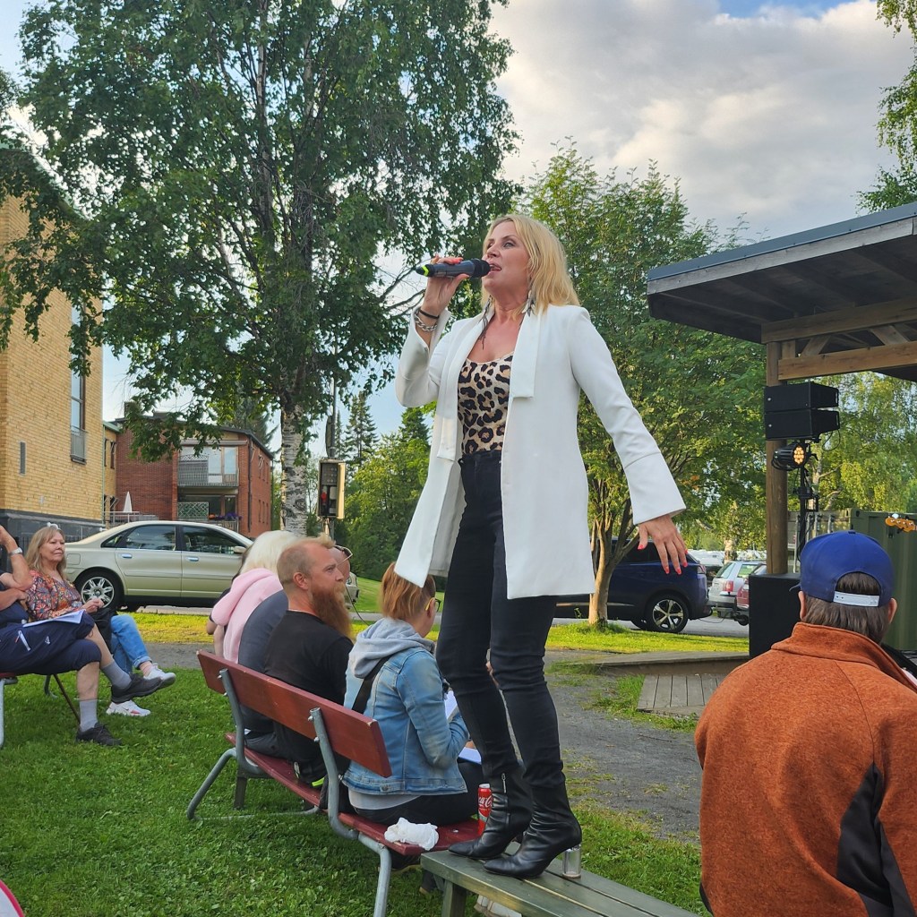 Sen på kvällen var jag, Bejan och Lina och lyssnade på Lena Olsson Björkén, hon hade allsång i parken. Hon är ju så duktig, det var roligt att lyssna på henne, Hon häll i gång som en riktig Pernilla och gick runt med micken, vi fick oxå sjunga med en sväng.