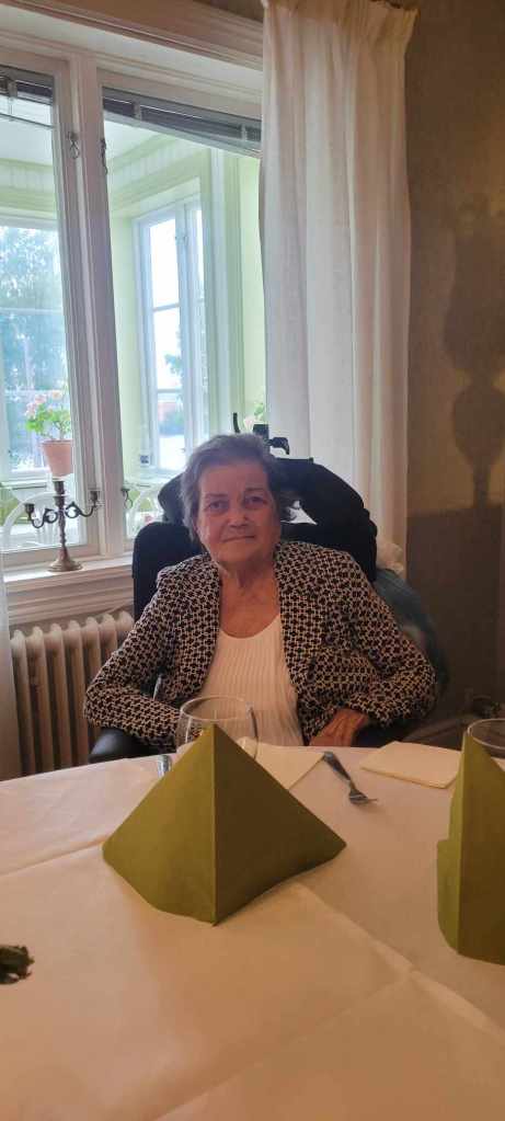 Vi andra kom dit. Vi var en stor baluns som vanligt ca 20 stycken. Mamma var så nöjd. Erika hade förstås lagat suverän mat, fläskfilé och olika sorters potatis, sallader, bröd, ost, såser, det var så gott!!!! Efterrätten med kaffe och två olika sorters tårtor och choklad mousse. Allt var så suveränt. Kåge och Marianne kom oxå och fikade med oss. Mamma blev så glad att de var med. Hon och Kåge har ju gått i samma klass. Så hon hade sagt åt personalen på boendet sen, jag har fått träffa min klasskamrat oxå. Erika får ju en att känna sig så hemma, speciell. Vi har ju känt varann sen vi var bebisar i princip och vi var mycket hos dom när vi var små. Så det känns ju som att sitta på middag hemma hos henne. Sen är hon ju säkert lika välkomnande till alla som kommer dit. Men hon har förmågan att göra varje gäst speciell. Hon tog emot, stannade och pratade en stund, det blev ju lite minnen som det alltid blir. Sen avlägsnar hon sig snyggt för att duka upp maten, fixa och dona med allt. Det var en verkligt lyckad eftermiddag. Mamma hade sagt åt Bejan i taxin, nog hade vi haft trevligt, hon var så nöjd.