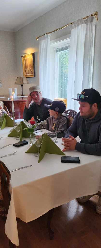 Annika och Bejan var redan där, de hade beställt taxin till kyrkogården. De gick runt med henne där och tittade på alla gravar. Sen gick de ner mot byn och tittade på huset där de bodde på sandviken, sågvärksbostäderna. Sen vidare förbi Svelins huset och svängde vid brandstation mot sågen och ner till Herrgår’n där vi skulle äta. Hon hade konstaterat efter vägen, vad jag känner igen mig, men nog har går åren fort.