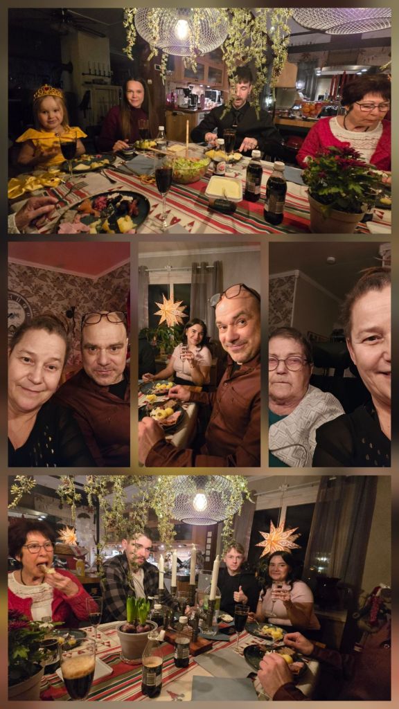 Vi satte igång jag och Danne, det var skala potatis, fixa äggen, duka bordet, köttbullarna skulle stekas klart, in med janssonen i ugnen ordna med allt som man skulle fixas innan alla gäster kom. Vi hann nästan byta kläder själva. Danne var finklädd men jag var fortfarande i jobbets t-shirt och trollor 🙂