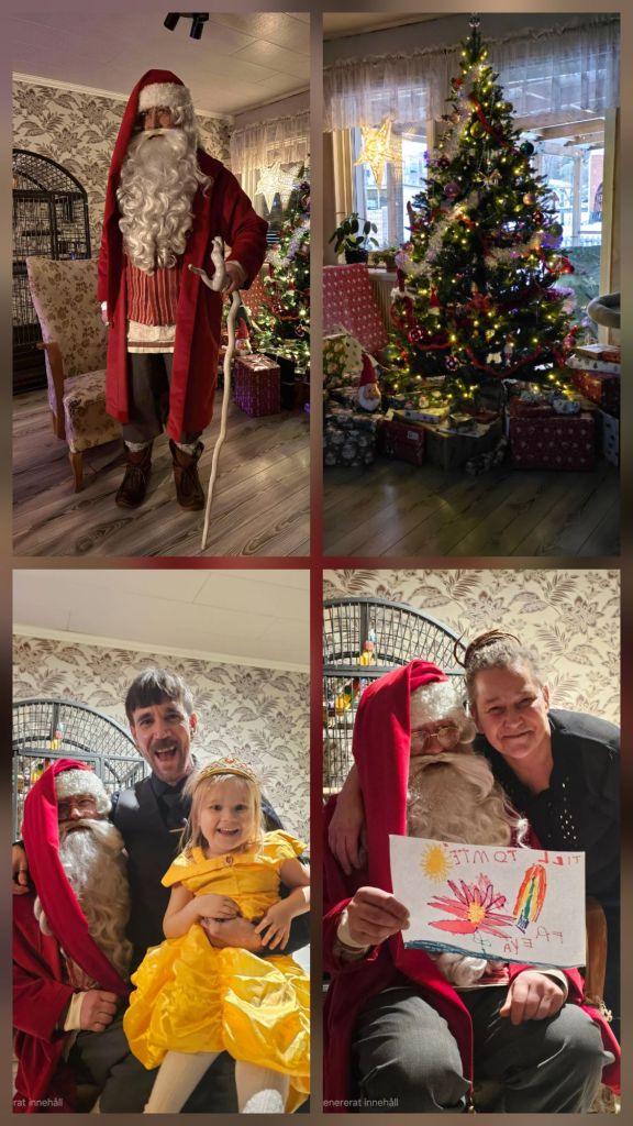 Vi var Rasmus, Savannah, mamma, Marianne, Jonathan, Nette, Freya, jag och Danne. Emil hann oxå komma till middagen. Han hade jobbat. Dennis och Alicia skulle ha kommit till tomten kl 18 men de hann inte så de kom efteråt. Men det spelade kanske ingen roll för Alicia, det var nog julklapparna som var det viktigaste 🙂