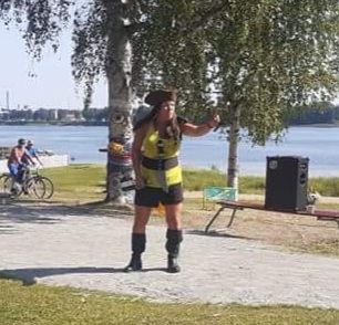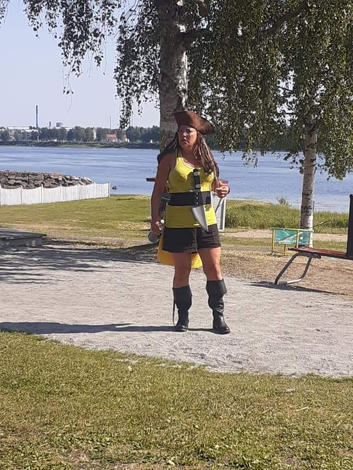 Hade en underbar dag igår, först Zumba Kids på stranden, det var mitt sista för detta år. Christa ville att jag skulle göra lite extra. Nå det var en en hel del förra veckan, Larrys op, Kalle dog, tankar om mamma, jobbet, zumbor osv. Så jag har inte hann inte tänka alls som jag skrev igår. Men 5 minuter innan jag skulle åka så hittade jag Danne gamla Kapten Jack Sparrow hatt och då kom tankarna i rullning, leta fram mina stövlar med pirat vikning och frans. En stor glasflaska som jag satte vatten och grön karamell färg i, bälte i midjan och en stooor pirat kniv! Monologen kom i huvudet när jag körde ner. Jag hade en kompis som vandrar här nere nånstans, jag gick och letade efter honom…. japp där var han. Jag går och byter om, kommer tillbaka som Kaptenen på strömmande Älven (men det glömde jag nog säga :D) Nå jag berättade för barnen att jag träffat en kompis som gav mig det här och så visar jag den gröna flaskan, ser ni honom och han vill bjuda er på det, drick inte det sa jag. Man får så lust att börja sjunga med mörk röst och en massa konstiga ord jag inte vet vad de betyder ens. Jag gick runt i publiken för att se om någon av dom har mörk röst och de hade det, jag låtsades bli jätte rädd. Sen sjöng vi Sjörövarsången från Pippi Långstrump!