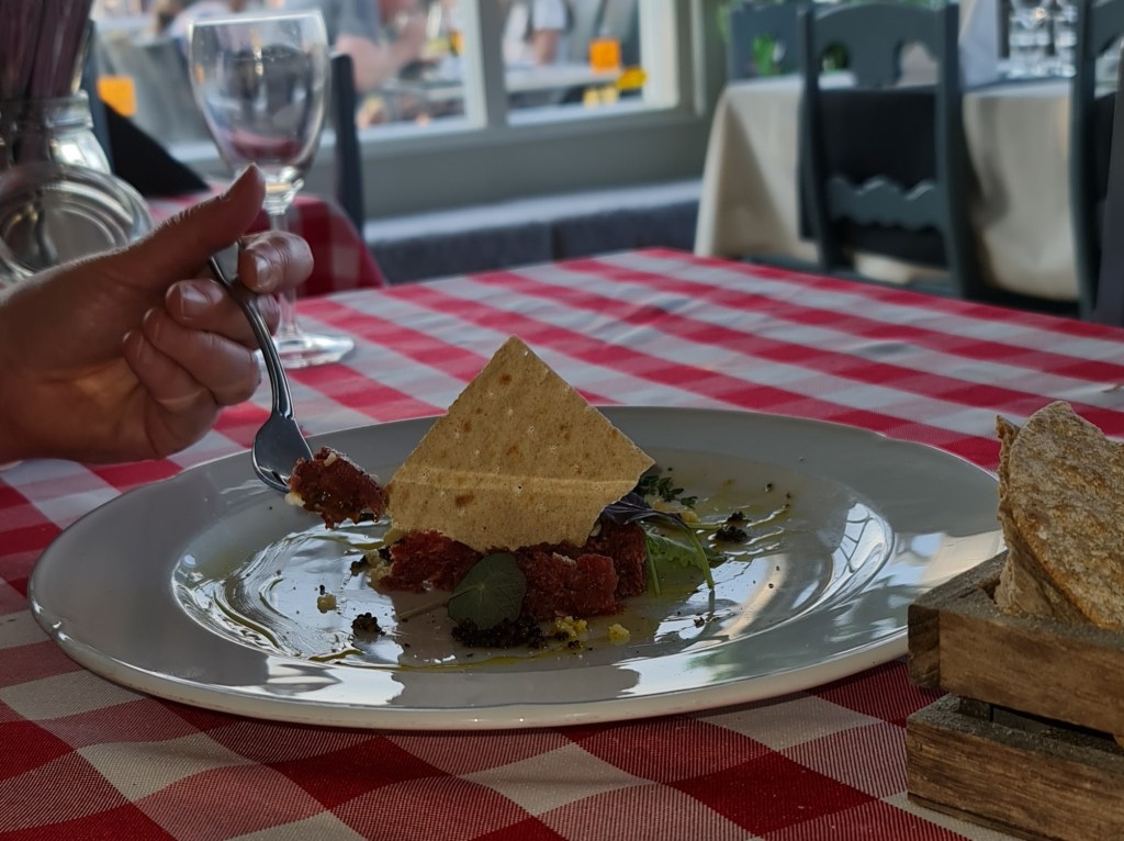 Sen hade vi middag jag Rellu, Marcus och Rollo med barn på Kukkolaforsen. Vi hade tänkt äta på River, Rellu har ju jobbat där så hon ville ha lite nostalgi men det var fullbokat. Så då valde vi Kukkola och det var verkligen en hit! Super bra mat, deras högrevsburgare var kanon. Marcus tog en renskavspizza som oxå tydligen var jätte god. Johanna såg till att vi hade bra vid bordet, Elin serverade och ställde upp och fotade oss. De hade nån lustig kupa som var över en maträtt så vi ville se vad det var, Johanna kom till oss och visade vad som dolde sig där under, en tartarbiff med senap gjord på Pesulas gård, tror Johanna sa att det inte odlas senapsplantor eller vad de nu heter så högt upp någon annanstans i världen. Häftigt va, gå in och kolla in deras sida Pesulas lantbruk Jag är ju en fegis så jag smakar ju inte sånt jag är osäker på, världens mest kinkiga när det kommer till mat. Men de andra tyckte det var jätte gott, Johanna kom nämligen ut med en till oss, Rollos son älskade det. Vi hade super trevligt, prat om livet, planering, zumba, vad gör vi och var är alla när det kommer till det, mycket skratt, det var jätte trevligt.