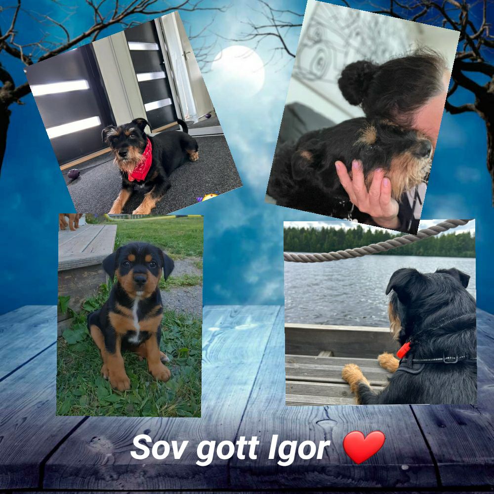 Fina lilla Igor, föddes i Juni en vacker sommardag 2017, en av 9 valpar. Full av lek, spex, snodde saker från de andra och sprang iväg med dom. Du älskade att vara ute på gräsmattan och springa, ligga under studsmattan och vila i skuggan. Det var full rulle på er alla. Du var kort och kompakt i kroppen, en så vacker valp. Johanna och Kari skulle din nya matte och husse heta, de fick äran att ta hem dig. Så den 11 augusti 2017 flyttade du hem till dom. Där har du haft ett händelserikt liv, du har varit med dom överallt på allt de gjort. Men nu efter några år med hälsoproblem så har du fått gå vidare över regnbågsbron, det fanns inget mer de kunde göra för dig, veterinär besöken har varit otaliga. Jag träffade dig i tisdagskväll. Johanna ville att du skulle få komma en sista gång dit du var född, hon ville göra det för dig, visa det. Jag var och träffade dig och man såg på hela dig att det inte längre var så bra, att du inte mådde bra. Jag är så tacksam över att jag fick träffa dig en sista gång ❤ Du var inte den du varit, sprallig och aktiv. Johanna sa att orken är borta, du har blivit förändrad. Det var som om du ville berätta att det är inte bra med mig. Så det var tufft att ta beslutet men idag har du fått gå, ditt lidande är slut. Tårarna rinner, jag vet vad de går igenom nu, de har gått hem med ett tomt koppel ❤